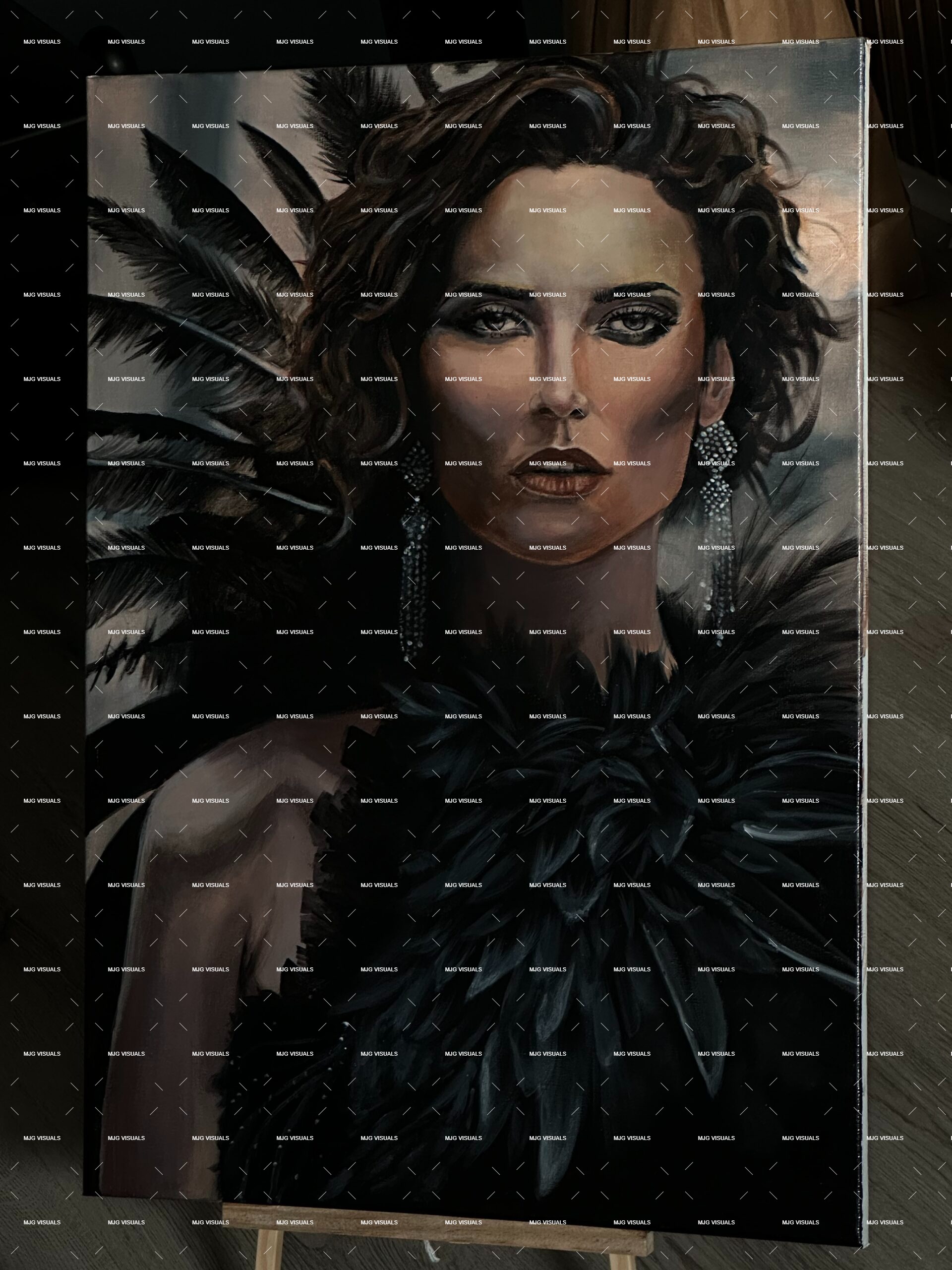 Ein fesselndes, stimmungsvolles Porträt: Beschwört den dramatischen Glamour und das Geheimnis der Art-Déco-Ära herauf. Inspiriert vom klassischen Hollywood und dem Geist einer modernen Femme Fatale, ist dieses Werk eine Erkundung von Stärke, Schatten und exquisiten Details. Die dunklen, geschichteten Federn erzeugen einen intensiven Kontrast zum Blick des Subjekts und ziehen den Betrachter in einen Moment kraftvoller, stiller Intensität.