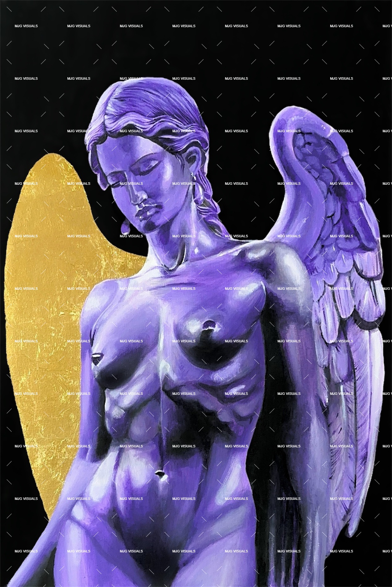Ein hypnotischer Mix aus klassischer Form und lebendiger, zeitgenössischer Farbe. „Purple Seraph“ zeigt eine klassische Skulptur, gebadet in intensivem violettem Licht, die dramatisch vor einem rein schwarzen Hintergrund inszeniert ist. Der Fokus liegt auf dem dynamischen Kontrast zwischen der skulpturalen Textur und dem handapplizierten Blattgold-Detail auf dem einzelnen Flügel. Dieser Kunstdruck – ob limitierte oder offene Auflage – ist ein großartiges Statement-Piece für moderne, luxuriöse und eklektische Interieurs